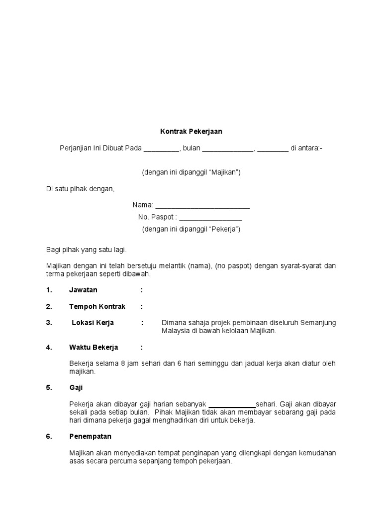 Untuk itu dibutuhkan suatu surat yang mengikat atau surat pernjanjian bagaimana pekerjaan tersebut dikerjakan secara borongan. Perjanjian kontrak dengan pekerja adalah penting untuk mengekang pekerja melanggar pelbagai kesalahan seperti berhenti kerja tanpa sebab, bercuti tanpa sebab, membocor maklumat syarikat dan sebagainya. Ada juga yang mungkin bekerja dengan sistem kontrak, sehingga tidak bisa bekerja lama di tempat tersebut dan akhirnya harus keluar ketika masa kontrak sudah usai. Contoh format surat perjanjian kontrak kerja untuk waktu tertentu (karyawan kontrak). Bekerja sebagai karyawan kontrak memang memiliki kekurangan tersendiri. Contoh surat pemberhentian ini memberitahu pekerja tentang pengakhiran pekerjaannya kerana masalah kehadiran. Biasanya surat ini dilengkapi dengan materai sebagai penguat kepercayaan dan agar terlihat kredibel. Gunakan huruf penamatan ini sebagai contoh apabila anda menulis surat penamatan anda sendiri. Dengan adanya surat lamaran pekerjaan ini, saya bermaksud untuk mengajukan diri untuk dapat bekerja di perusahaan yang bapak/ibu pimpin. Telah bekerja pada perusahaan yang kami pimpin yang bersangkutan berhenti karena habisnya masa kontrak di nama perusahaan/pt. Perlu lebih banyak contoh surat penamatan yang membakar pekerja untuk tujuan? Surat kontrak kerja adalah surat yang berisi perjanjian yang saling mengikat dalam masa tertentu antara pemberi kerja dengan seorang pekerja. Bagi kamu yang bekerja di sektor formal tentu sudah tidak asing lagi dengan surat kontrak kerja.