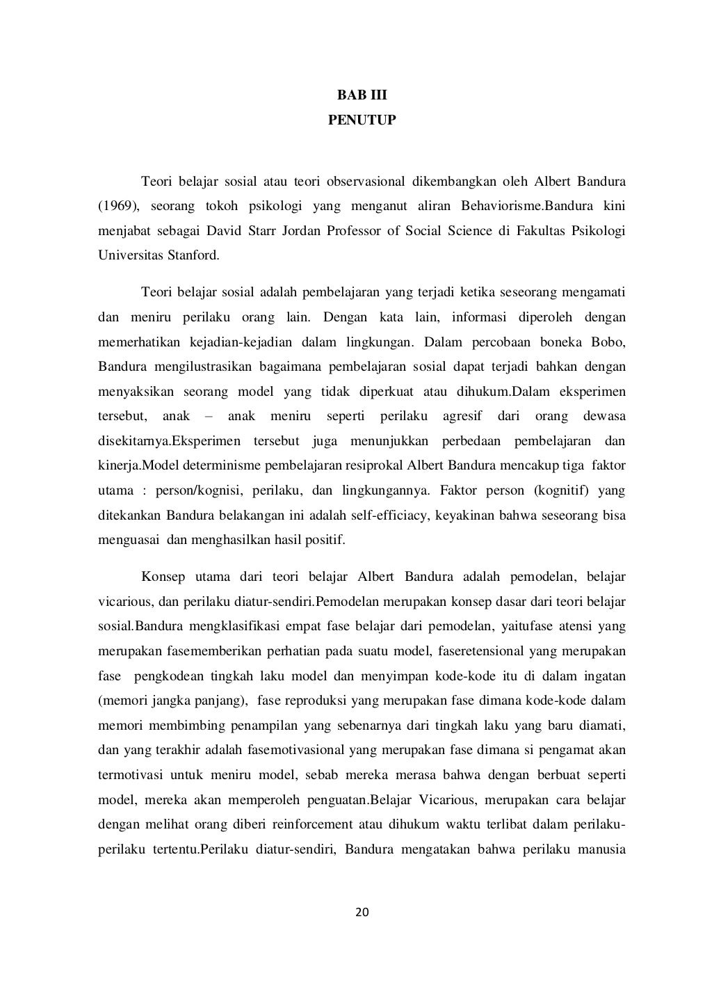 Teori pembelajaran sosial albert bandura. Bandura, didasarkan atas proposisi bahwa baik proses sosial maupun proses kognitif adalah sentral bagi 15 apr 2018 download our teori belajar sosial albert bandura pdf ebooks for free and learn more about teori belajar sosial albert bandura pdf. Simpan simpan teori pembelajaran pdf untuk nanti. Sebagai kesimpulan, bandura menyatakan bahwa teori belajar sosial adalah kombinasi dari lingkungan dan faktor kognitif. Albert bandura menjabat sebagai ketua apa pada tahun 1974 dan pernah dianugerahi penghargaan distinguished scientist award pada tahun. Program pembelajaran remedial bagi siswa yang mengalami kesulitan belajar matematika di 3 sdn 002 teluk bintan. Teori pembelajaran sosial bandura pdf. Perspektif teori kognitif sosial lahir berdasar atas dari kritik terhadap teori yang dikembangkan oleh ahli behavioristik. Teori pembelajaran sosial ini dikembangkan oleh albert bandura (1986). Teori pembelajaran sosial merupakan perluasan dari teori belajar perilaku yang tradisional (behavioristik)1. Karya besar bandura yang masih digunakan saat ini adalah teori kognitif sosial. Teori belajar bandura dan implementasinya dalam pembelajaran. 2.5 kelemahan dan kelebihan teori belajar sosial5 a) kelemahan teori belajar sosial albert bandura teori belajar sosial albert bandura sangat sesuai jika diklasifikasikan dalam teori behavioristik.